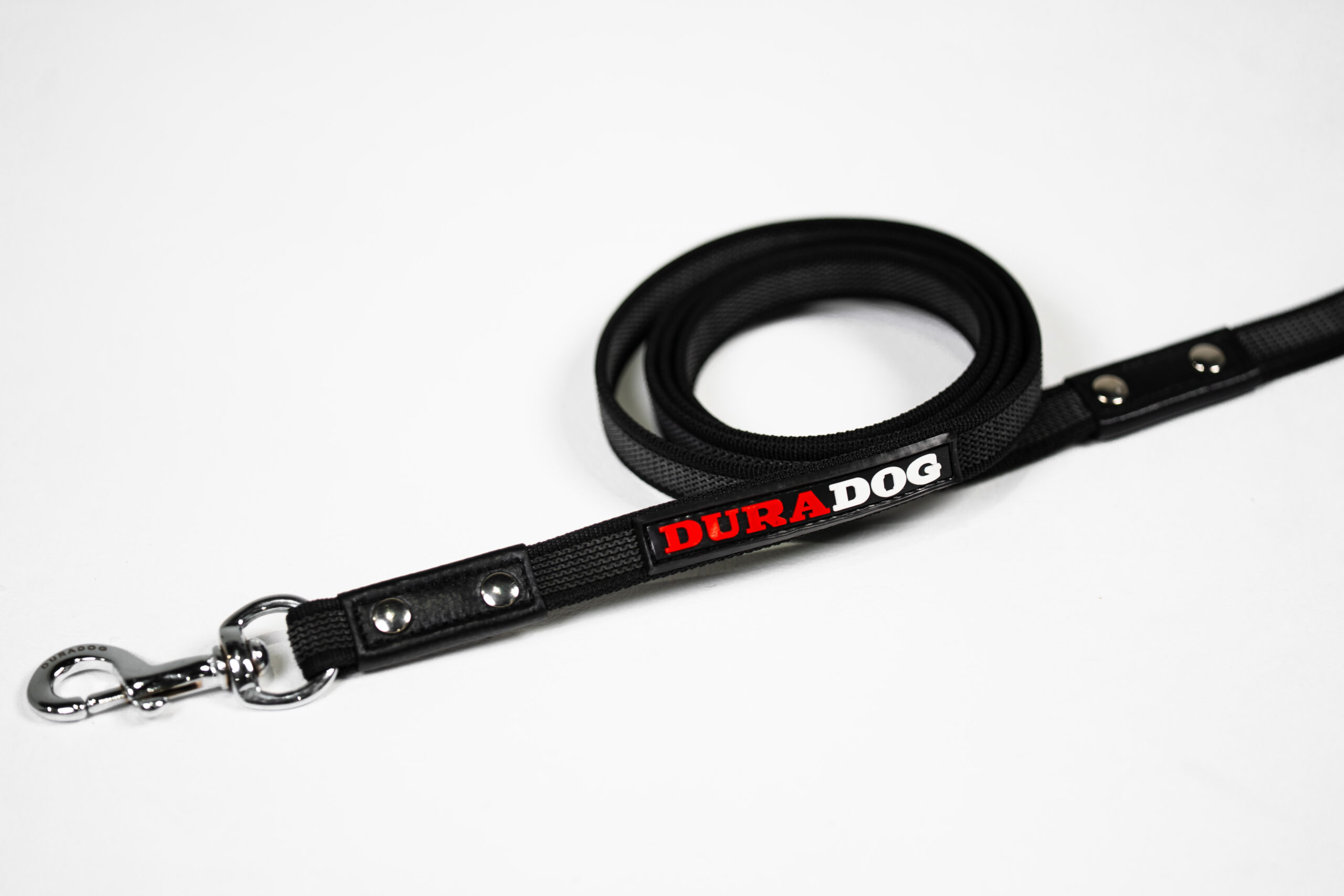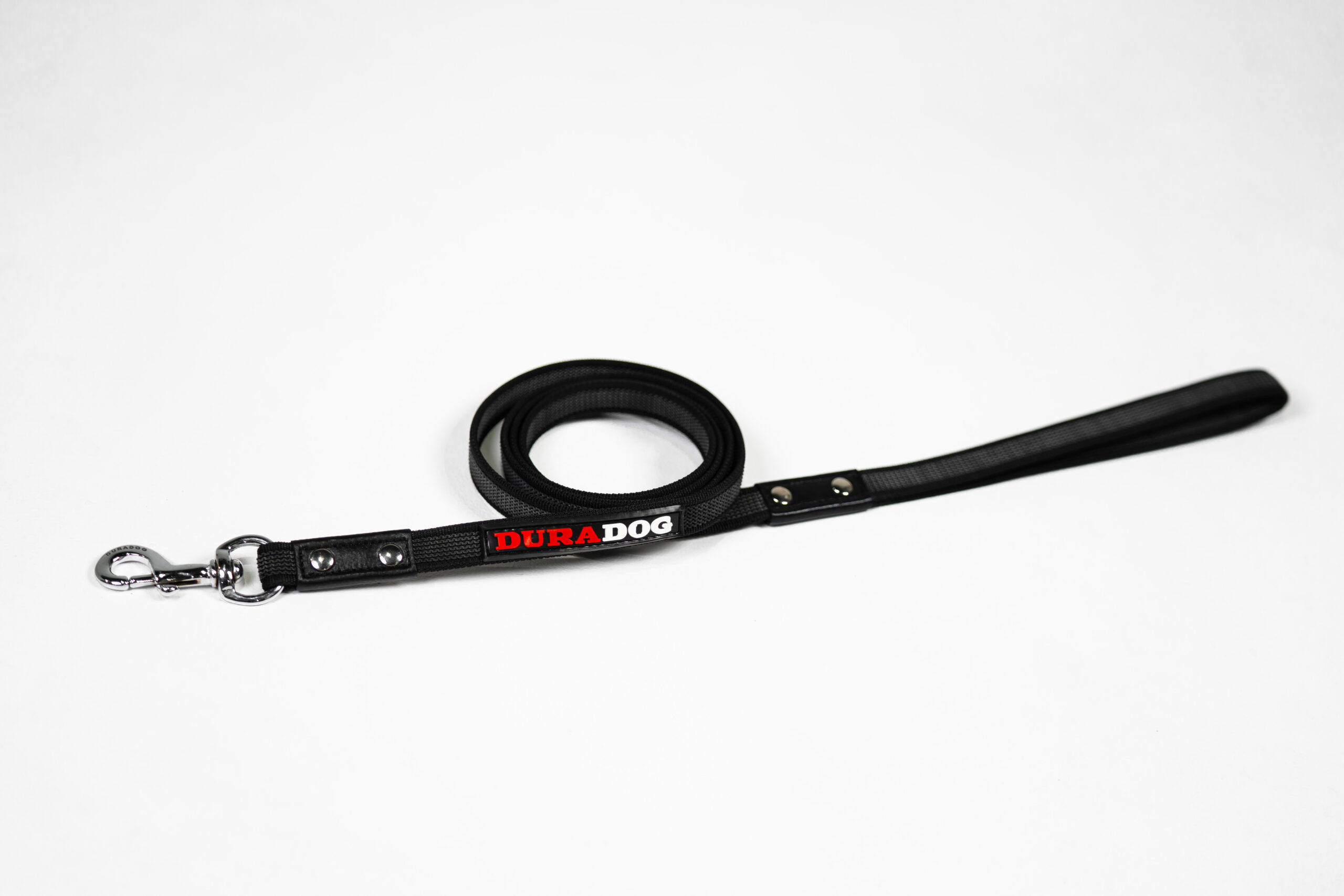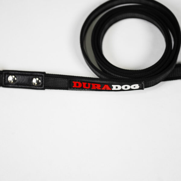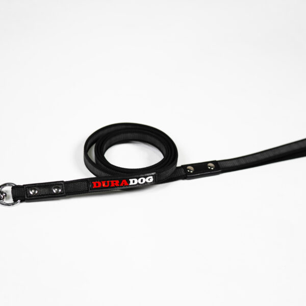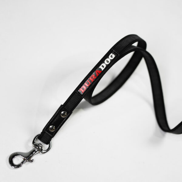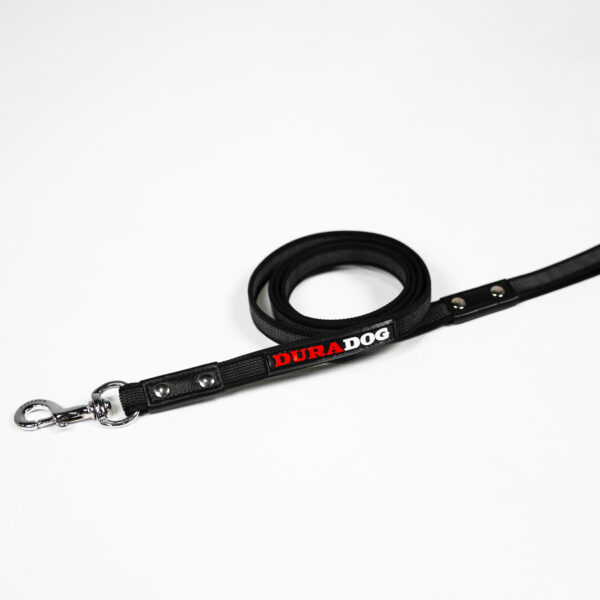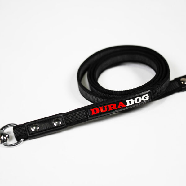 Black nylon with grey rubber this is the perfect dog training leash. Suitable for all sized dogs this leash is lightweight yet strong in all the right places. Stylish DuraDog design with DuraDog logo. Stainless steel lightweight clip with stainless steel rivets to reinforce already great stitching. Refreshing grip leash that’s made to last. Available In 2 sizes 120cm and 180cm.